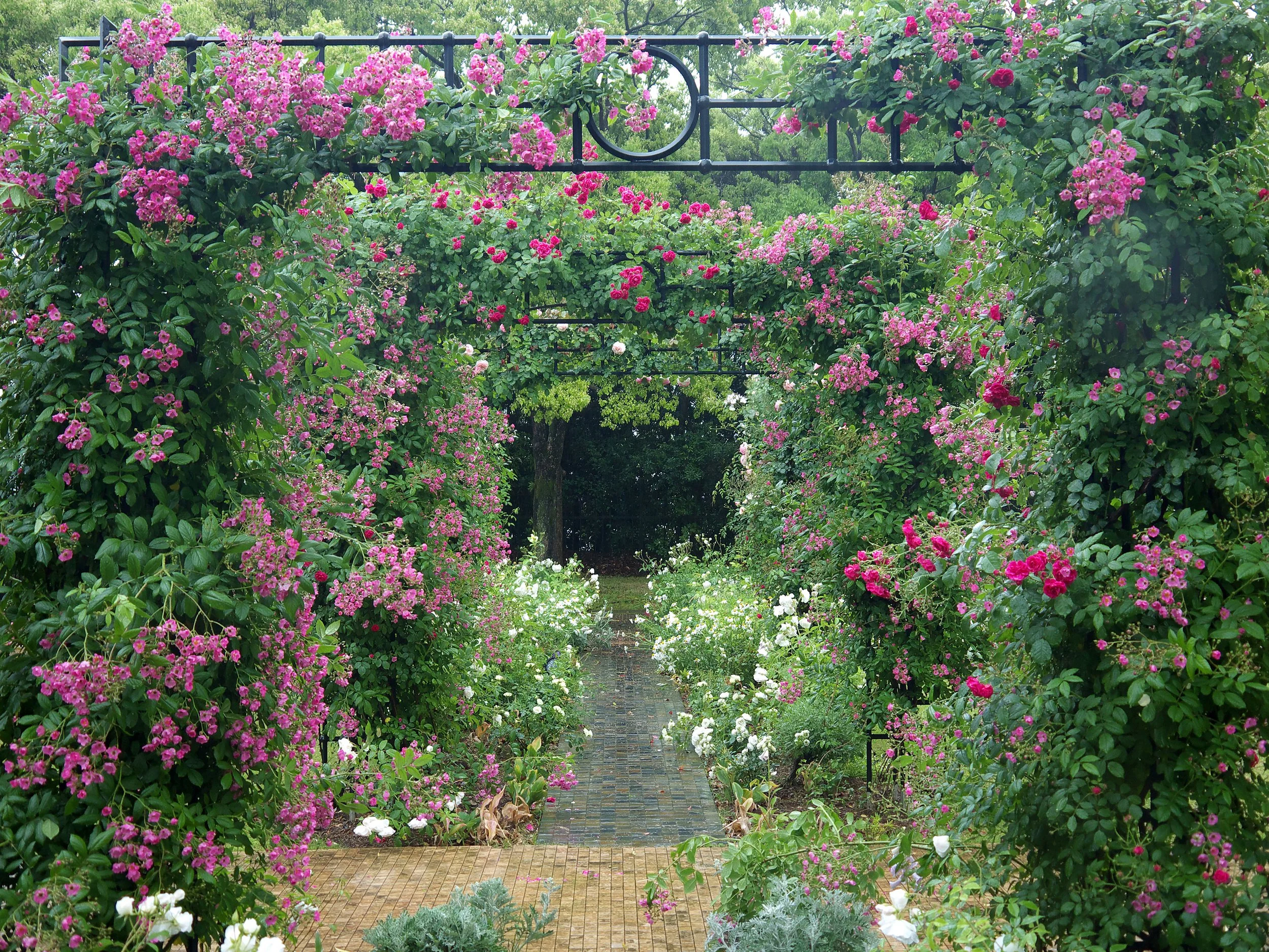 Set the arch/pergola first. Then build a compacted terrace (crusher‑run base + fines), edged cleanly. Good bones beat piles of petals.