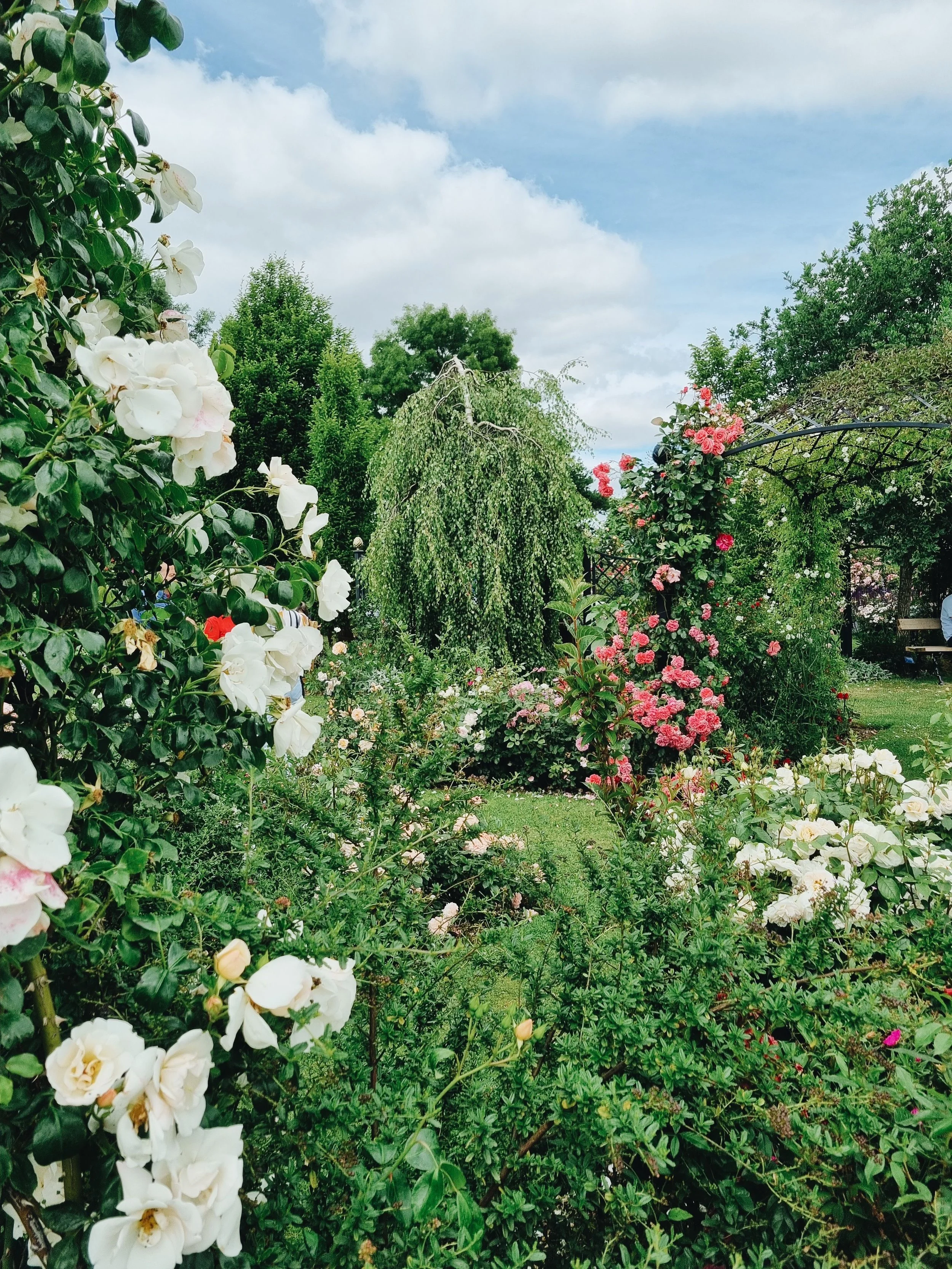 Private corner, evening light. Arch + small terrace + 2 evergreens. Plant a few big, tough shrubs and one climber. Deep water, keep it simple, let it grow.